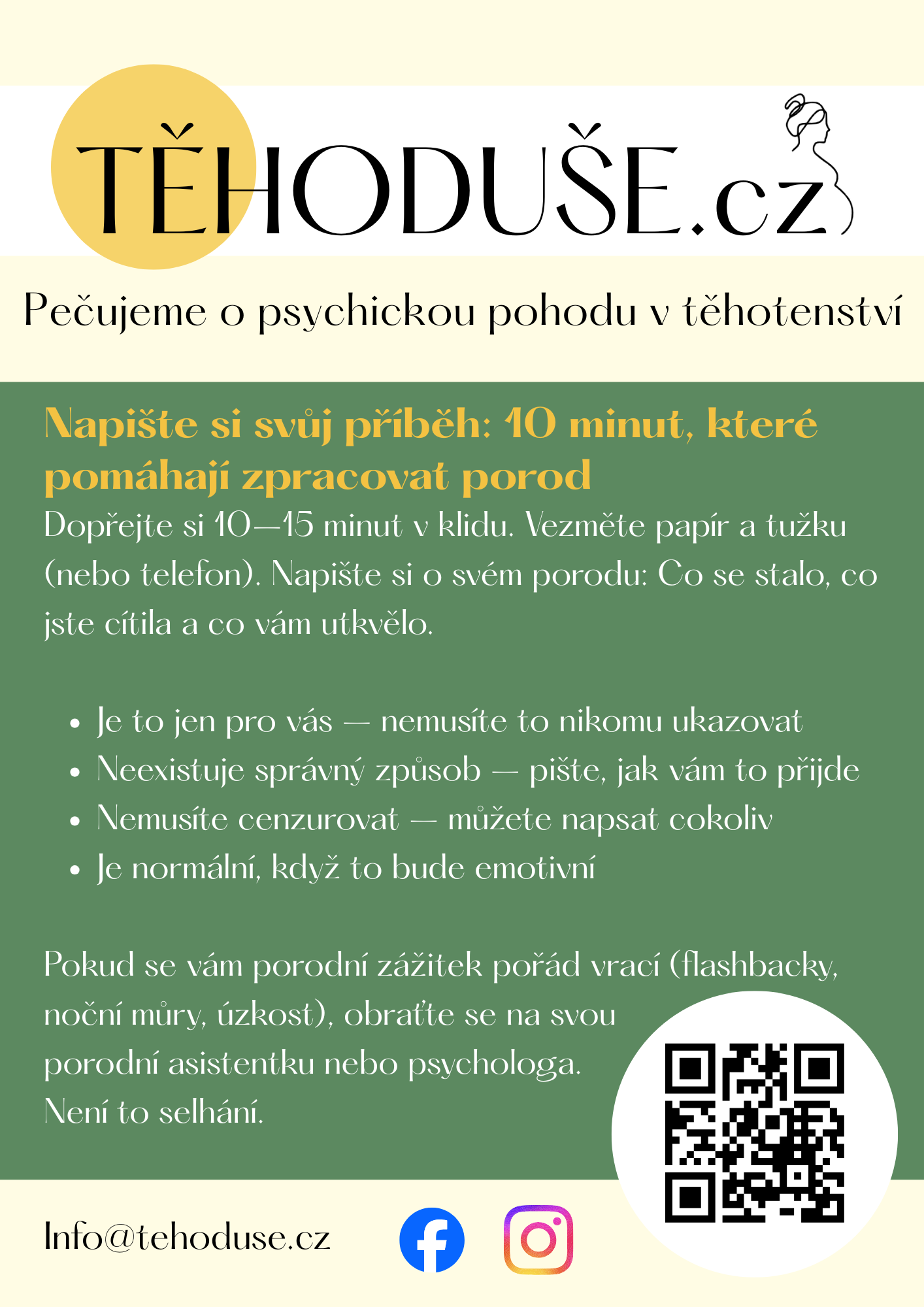 Co: 48 hodin po porodu žena dostane instrukci napsat 10–15 minut o své porodní zkušenosti. Text je jen pro ni.