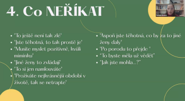Probrali jsme obecné principy empatické komunikace a zaměřili jsme se na specifika práce s těhotnými ženami a čerstvými matkami. Vysvětlili jsme si, jak sdělovat špatné zprávy citlivě a podporujícím způsobem, jak reagovat na emocionální reakce a jak předávat informace způsobem, který nezvyšuje úzkost. Ukázali jsme si také, kdy a jak vhodně odkazovat na odbornou psychologickou pomoc.